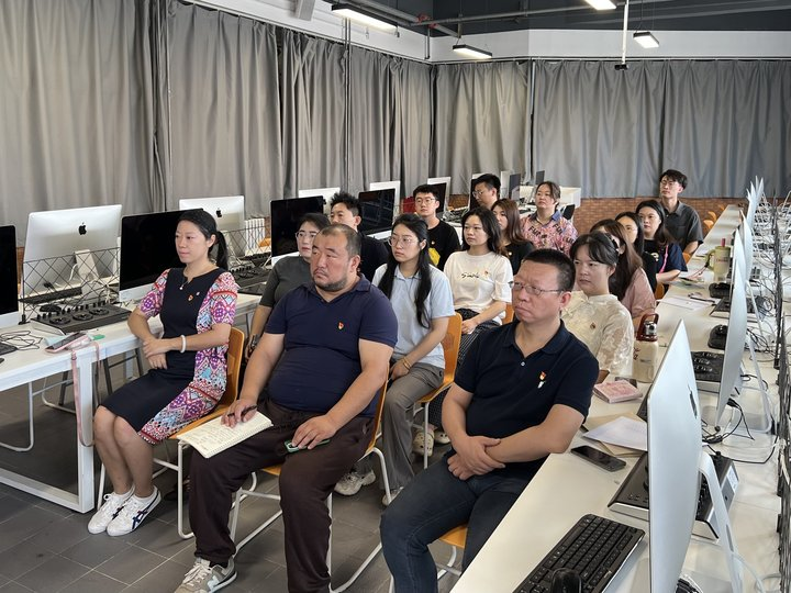 上午8时50分,数字艺术与动画学院225机房内,全体党员佩戴党徽,整齐就座,怀着无比崇敬的心情等待大会开始。九时整,纪念大会正式开始,全体党员全神贯注地观看直播画面。当国旗冉冉升起、国歌奏响时,在场党员全体起立,行注目礼,每个人的脸上都写满了庄严与自豪。